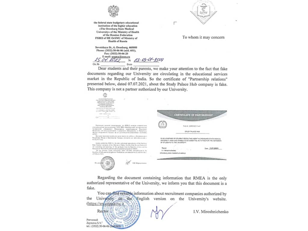 Furthermore, documents claiming that RMEA is the only authorized representative of Orenburg State Medical University are also counterfeit. The University urges students and parents to exercise caution and verify any documents or claims of affiliation directly through official University channels.